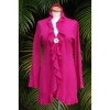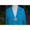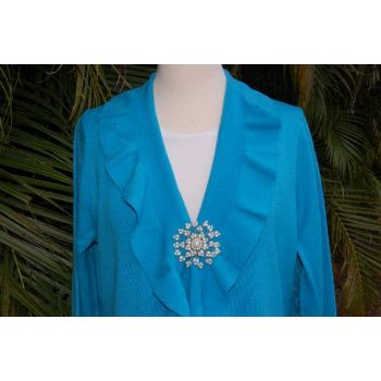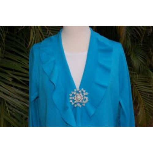 100% washable wool ruffle sweater! A great travel piece being that you can wash on the run! Always flattering with the soft ruffle neck; dress it up for night with one of our brooches (Sea Lotus shown), wear it open with jeans or belt it. Available in Raspberry (shown), Lavender, Black, Turquoise (shown), Heather Grey & the newest color - Camel.
