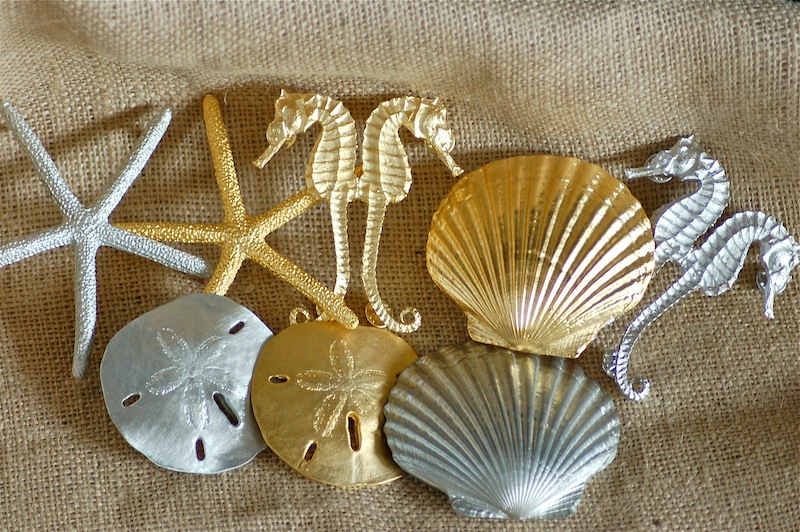 The medium half moon basket is a great daily purse size. The Casting is made in the USA & plated in 24k gold. Just need to pick your ribbon color & casting. OR you can forego the ribbon and just use a casting to go with ANYTHING you wear! Shown in the photos: aqua with gold starfish; navy with silver seahorses.